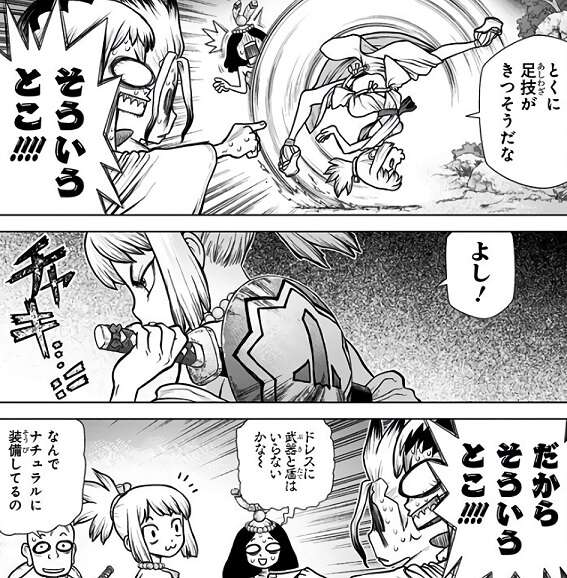 アマリリスから石化武器の話を聞いた千空は、アマリリスやコハクを後宮に潜入させて、頭首一味から石化武器を盗ることにします。それには、コハクが後宮選抜に選ばれる必要がありますが、コハクは男勝りな行動をナチュラルにするので、色々と対策を立てる必要があります。