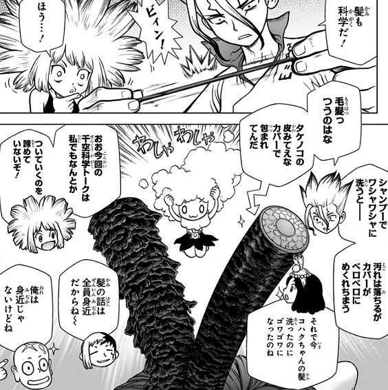 無事、ラボカーをゲットして脱出に成功した千空達は、隠れ家でコハクのビューティ大改造を行います。まずは留めっぱなしの髪を解いて、髪形を後宮選抜向けに変えようとしますが、ヒドイ癖毛で髪形を変えることが出来ません。そこでココナッツや水酸化ナトリウム、硫酸からシャンプーを作り、さらにコンディショナーも加えて、コハクの髪をサラサラにしようとします。