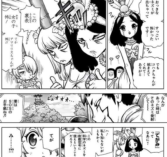 コハクは頭首の棲む大木のある根元に化学王国の勝利のカギを見つけますが、千空達 化学チームと連絡する手段がなく、どう連絡すればいいか悩みます。そこに、千空からネズミのように見えるミニ四駆が送られてきて、何かあった時は連絡手段として使う様に通信が入ります。