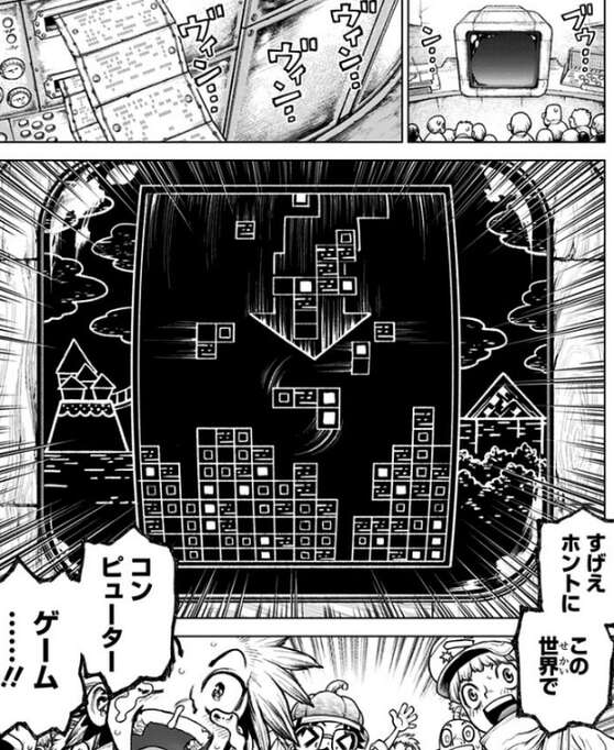 日本での石化復活者も増え、大人数になったので龍水は新たな娯楽メディアが欲しいと言い出します。そこでテレビを作成し、さらに完成したコンピューターを繋いで、SAI待望のコンピューターゲームが完成します。順調に月旅行への準備が進みますが、ある日厳重に保管しているはずの石化装置メデューサが、突然起動し始めます。