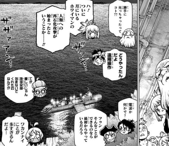 地球一周を遂げて日本に帰ってきた千空達は、石化している宝島や石神村の人々を石化復活液で復活させます。日本本土では千空が設計し、ルリ達が建設しているダムを使った水力発電所が完成しつつありました。この水力発電所を使ってロケット本体のアルミニウムを作り、ロケットを完成させます。
