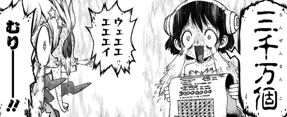 コンピューターを作るために、千空はコーンシティ組にパラメトロンに続いてメモリの作成を依頼します。メモリは磁石にデータをセーブすることで実現させれて、大量の磁石が必要となります。コーンシティ組に磁石を大量に作り縫い合わせる作業が必要になると千空は説明しますが、必要な磁石は三千万個でコーンシティ組は絶望的な数に悲鳴を上げます。