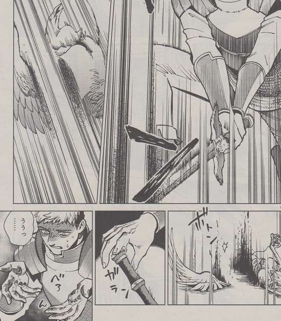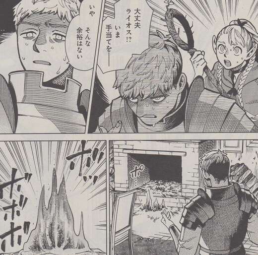 鳥の魔物の攻撃を剣で受け止めますが、鳥の魔物は突然燃え上がり熱を帯び、ライオスの剣にも熱が伝わります。頭突きで鳥の魔物をひるませた隙に、鳥の魔物を剣で切り裂いて倒しますが、剣に伝わった熱のせいでライオスの手のひらの皮がただれています。