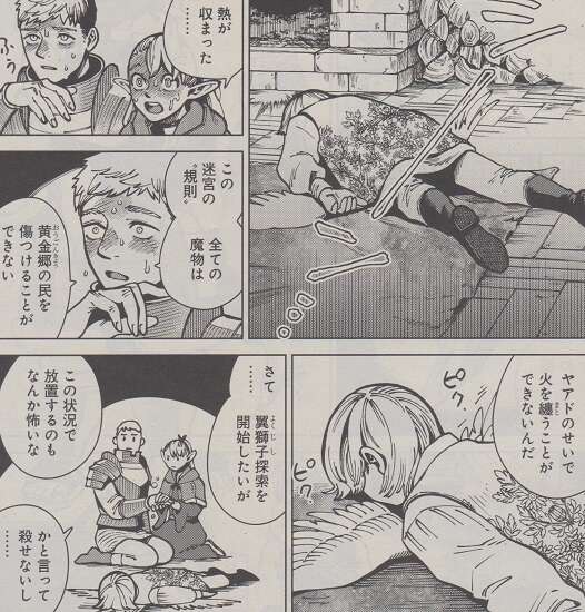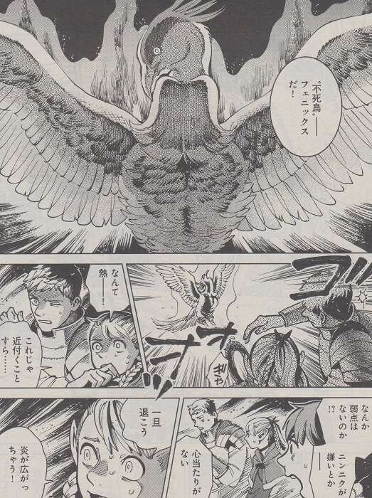 こんな特徴を持つ魔物はひとつしかない、とライオスは言い、不死鳥、フェニックスだ!とこの鳥の魔物をフェニックスと断言します。炎に包まれたフェニックスはかなりの熱を帯びていて、近づく事すらできません。まずはヤアドを安全な場所にとライオスは考えますが、その時この迷宮のある“規則”を思い出します。