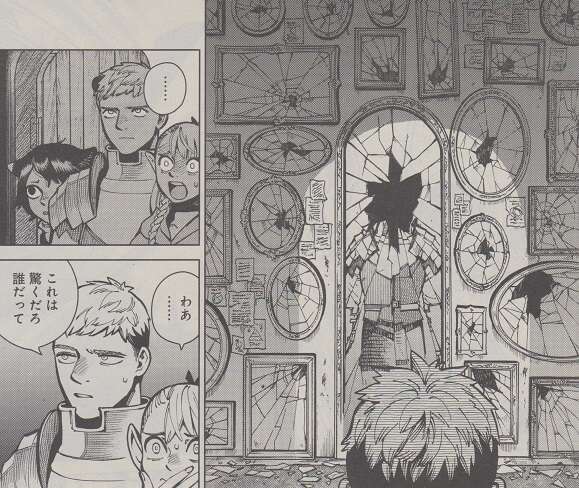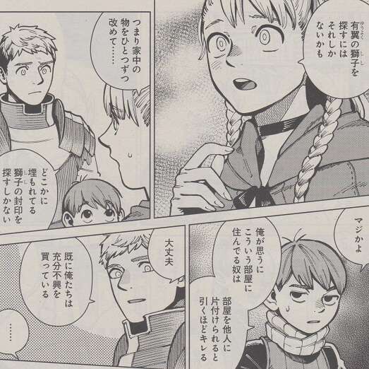 それを見たマルシルは有翼の獅子を探すには、家中の物を掃除し、片付けながら、どこかに埋もれている獅子の封印を探すしかない、と言います。チルチャックは、こういう部屋に住んでいる奴は、部屋を他人に片付けられると引くほどキレると、片づけを嫌がりますが、既に十分狂乱の魔術師の不興を買っている、とライオスは気にせずやろうと言います。