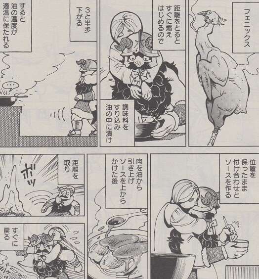 一方、センシはフェニックスの特徴、距離をとると体が燃えはじめる特性を利用しながら、調理をしてファニックスの肉を油でじっくり煮込みます。そしてソースを上からかけた後、再び距離を取って火を入れ、肉を仕上げます。