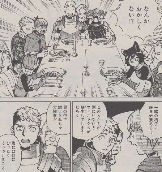 が、食事をしている皆の側には黄金郷の民がぴったりとくっついています。マルシルがおかしくない!?と大声を上げますが、フェニックスが蘇生してしまう、胃の中で燃えられちゃ大惨事だ、とライオスは冷静にマルシルに説明します。