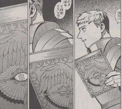 罪悪感にかられるマルシルですが、ある本を書庫で見つけた事を思い出しその本をライオスに見せます。その本の装丁はシスルが持っていた本にそっくりで、マルシルはこの本に翼獅子が封印されているのでは、と考えます。