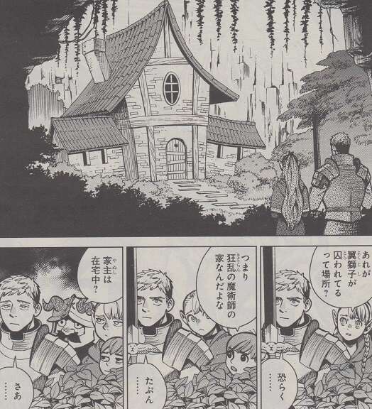 翼獅子が囚われてる場所、そして狂乱の魔術師の家にたどりついたライオス達ですが、マルシルとチルチャックは何があるか分からないので、様子見した方がいいと言います。しかし、ケン助を通して翼獅子は家の中に入るように意思表示をしてきます。