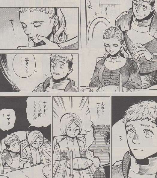 マルシルとライオスがご飯の後、本を調べようと話していると、本の目の部分が静かに開きます。しかし、ライオスは気付かずにフェニックスのコンフィを、柔らかい、おいしい、と食事を続けます。