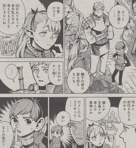 眠っている人たちが気になりますが、とりあえずライオス達は翼獅子を探すことにします。が、ざっと見た感じですが翼獅子の姿は影も形もありません。囚われているって多分私たちが考えてるような形じゃないね、とマルシルは言い例えば鏡、水晶、本、巻物などに封印されている可能性の方が高いとマルシルは話します。そんな会話をしていると、暖炉の方から何か音が聞こえてきます。