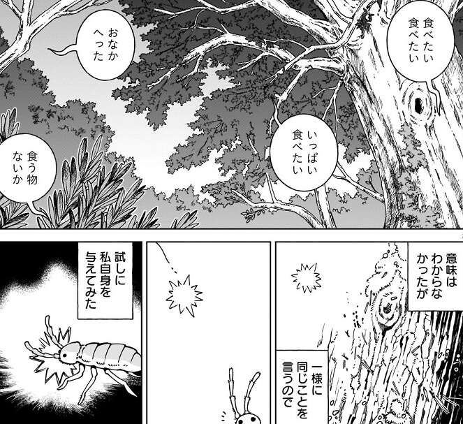 ある日、これに一体なんの意味があるのか、気になった翼獅子は真似をしてみます。生物の食べたいと言う欲望を食べてみると、これがとても美味しく、翼獅子は食欲というものを理解します。ただ、欲望を食べてしまうと生物は死んでしまい、失われてしまうことも翼獅子は知ります。翼獅子は少しずつ味わうことにします。