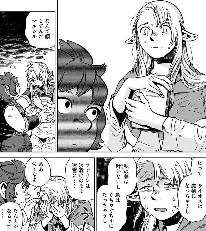 ナマリからライオスがどうなったか聞かれ、マルシルは魔物の姿で悪魔と戦い、今は消息不明だと説明します。マルシルは一通り、皆に経緯を説明した後、落ち込んでしまいます。ライオスは魔物になり、自分の人種間の極端な寿命差をなくしたいという夢は叶わず、島はぐちゃぐちゃになり、ファリンは氷漬けのまま迷宮に置いてきてしまった、という状況を思い出し落ち込んでしまったようです。