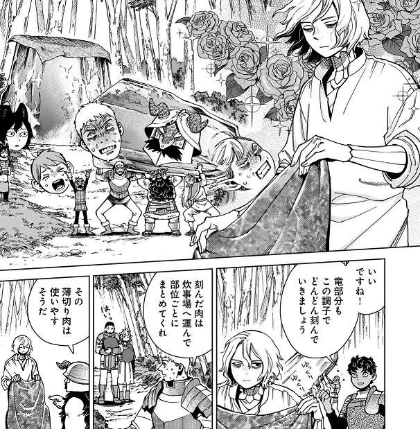 前回の記事はこちらです。ライオスは皆と協力してファリンの竜部分を食べようと、調理の準備を始めます。