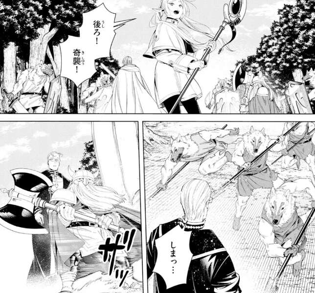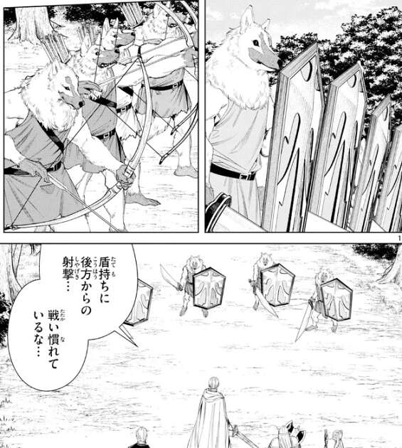 そんな話をしながら北部高原を歩いていると、一行は嫌な感じを察知します。フリーレンも魔力探知で気づいていて、かなりの数の魔物がきるようです。すると、弓や剣、盾で武装した人獣のような魔物が何体も襲い掛かってきます。