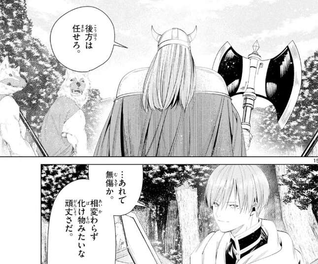 後方は任せろ、とアイゼンは言い、アイゼンの身体の頑丈さに、あれで無傷化、相変わらず化け物みたいな頑丈さだ、とヒンメルは驚きを通り越してあきれています。しかし、安心して背中を預けられると、ヒンメルは言い、前方の敵に集中します。