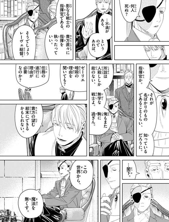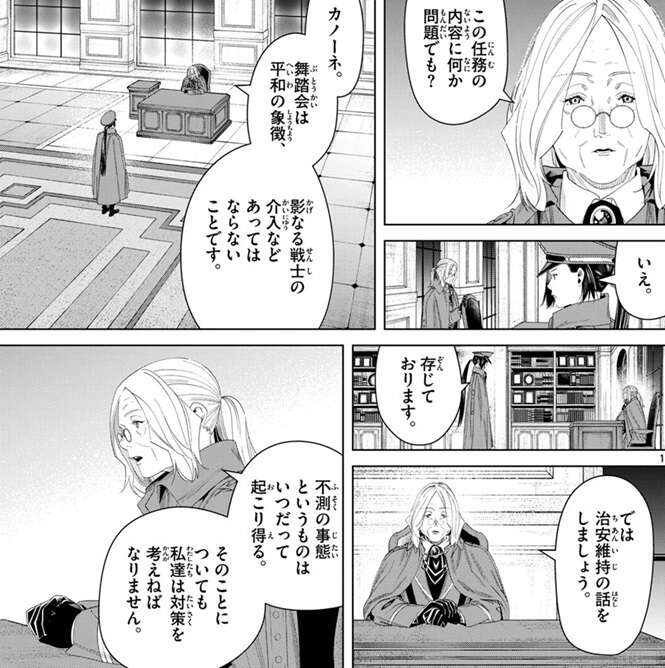 いつ掻き消えてもおかしくないような、臆病なほど薄く精密な魔力が帝都を包み込むように張り巡らされているようです。場面は変わって魔導特務隊の隊長・フラーゼがいる部屋に移ります。フラーゼと副隊長のカノーネが部屋にいて、カノーネがフラーゼに舞踏会の警備が滞りなく進んでいる事を報告しています。フラーゼは魔導特務隊が自由に動けるように上と掛け合った事をカノーネに伝えますが、カノーネは任務とは何かと問い質します。