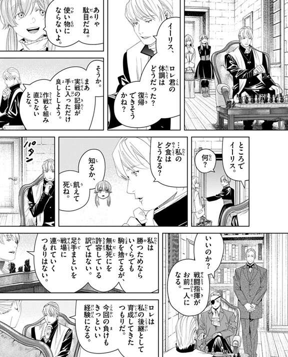 ヴァルロスはクライスにその僧侶はフリーレンのパーティーで、新たににリストに加えられた、と言いますが、クライスはあまり気にしていません。一方、フェルンにやられたロレはイーリスからサンドイッチを貰いますが、布団から出てきません。ロレは死んでいないようですが、戦線復帰するのは時間がかかりそうです。しかしクレマティスは冷酷の人間なようで、他の人間を任務を遂行するための駒としてしか見ておらず、ロレを無理やり戦線復帰させるかもしれません。