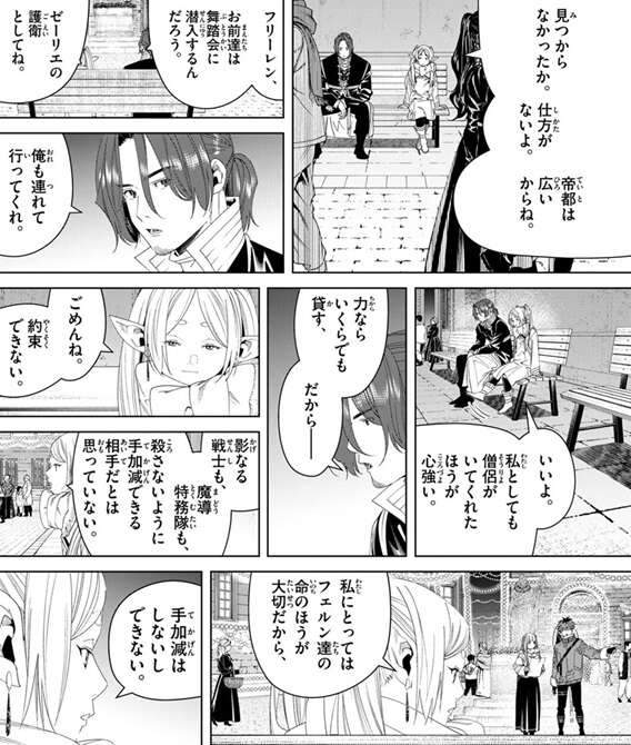 フリーレンはザインが帝都で“戦士ゴリラ”を探している事を知っていて、見つからなかったか、仕方がないよ、とザインに話しかけます。ザインは舞踏会に潜入するなら俺も連れて行ってくれと言い、フリーレンもいいよと答えます。ザインは力ならいくらでも貸す、と言いますが、フリーレンは、影なる戦士も魔導特務隊も殺さないように手加減できる相手だとは思っていない、と言い、ザインの親友の“戦士ゴリラ”がいても手加減できないとザインに言います。それでもできる限りの努力はするつもりだとフリーレンが言うと、ザインもそれで十分だよと答えます。フリーレンはフランメが残したこの帝国に思い入れがあるようで、ゼーリエ護衛の任務を本気で遂行するようです。そして、既にフリーレンに対しても魔力探知されているようで、バチバチと反応が出ます。