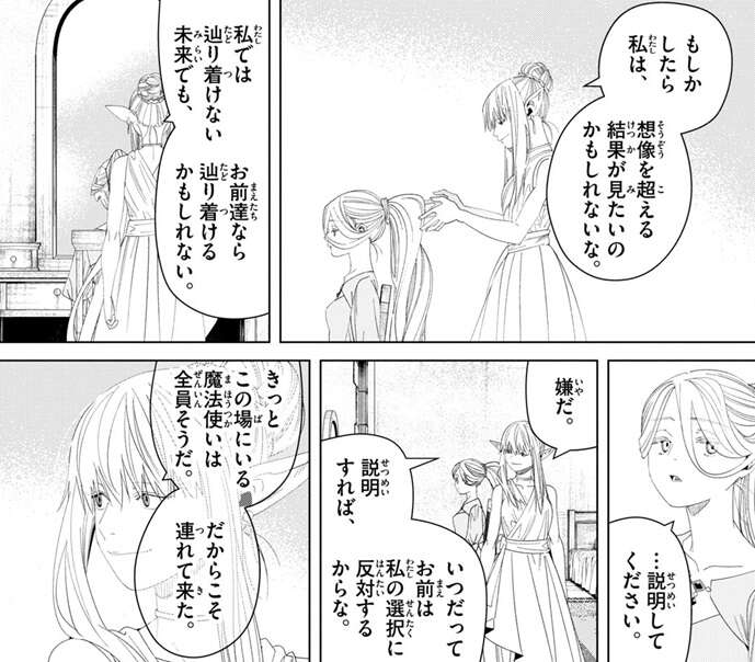 もしかしたら私は、想像を超える結果が見たいのかもしれないな、私では辿り着けない未来でも、お前達なら辿り着けるかもしれない、とゼーリエは言いますが、ゼンゼは説明してくださいと言います。しかし嫌だとゼーリエは言い、説明すればお前は私の選択に反対すると言いゼンゼを誤魔化します。きっとこの場にいる魔法使いは全員そうだ、だからこそ連れて来た、とゼーリエが言った後、全員が宮殿へと向かいます。
