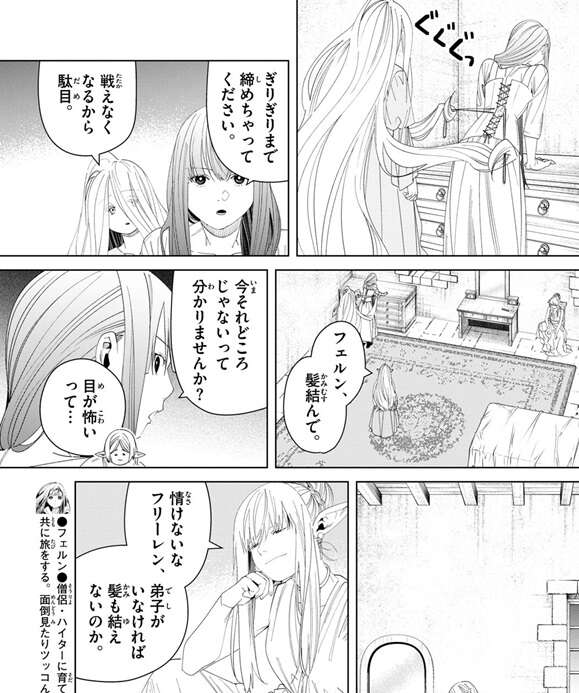 続いてフェルンやフリーレン達、女性陣が正装に着替えていますが、フェルンはゼンゼにコルセットを締めてもらっています。ぎりぎりまで締めるようにフェルンはゼンゼに要求していますが、ゼンゼは戦えなくなるから駄目と言います。それでもフェルンは納得しないようでゼンゼに締めてもらい、自分で髪を結べないフリーレンがフェルンに、髪結んで、とお願いに来ても、今それどころじゃないって分かりませんか?と、必死の形相で答え、フリーレンは、目が怖いって…、とつぶやきます。フリーレンは仕方なくフェルンが納得するまで待つ事にしますが、ゼーリエから弟子がいなければ髪も結えないのかと言われてしまいます。