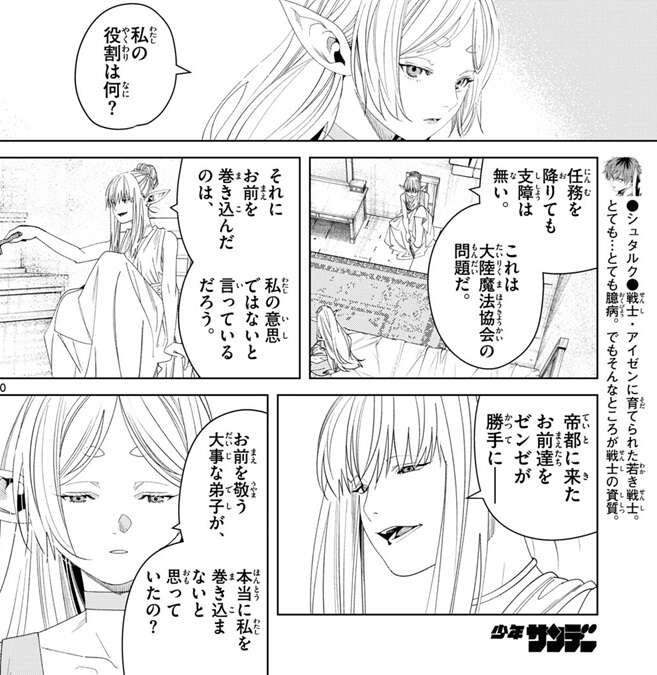 フリーレンは、ゼーリエだって似たようなものでしょ、と言い返しますが、ゼーリエは、それだけ慕われている、お前と違ってな、とさらに言い返します。そして、ゼーリエはフリーレンの髪を私が結んでやってもいいと言いますが、死ね、とフリーレンからきつい言葉が返ってきます。ゼーリエは今回の任務に巻き込む形になったが、それはゼンゼが配慮した結果でゼーリエの意志ではないと言い、不満があるのなら任務を降りて構わないし、フェルンにも無理強いはしないと、ゼーリエはフリーレンに言います。