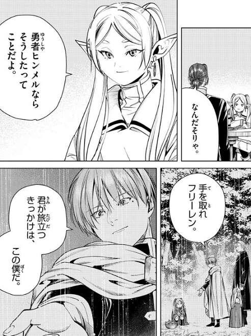 ザインは気になっていたと言い、なんで俺なんかにこんなに構ってくれるんだとフリーレンに質問します。すると、やっぱり同族嫌悪かな、冒険に出ようとしないザインが、魔王討伐に旅立つ前の私によく似ていて頭に来た、とフリーレンはザインに言います。それは構う理由にはらなねぇだろう、と言うザインに、だからこそ、きっと私はきっかけを与えたかったんだろうね、と言い、勇者ヒンメルならそうしたってことだよ、とヒンメルの事を思い出します。