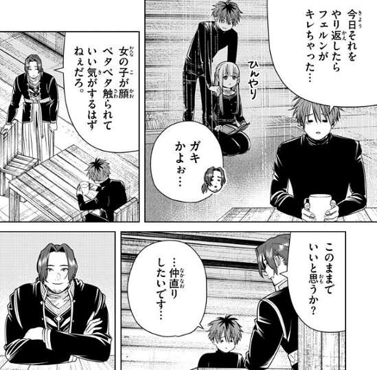 さらにザインは、今度はフェルンから話を聞くと、私が意地になってしまったので…、謝りたいです、とフェルンは言います。フェルンは触られたことは気にしていないようですが、ただ肩を押さえた腕の力が強くて、…ちょっとだけ怖いと思ってしまったんです、とフェルンはザインに気持ちを説明します。