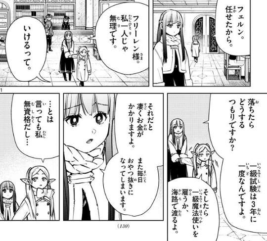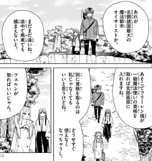 しかし、一級魔法使いというのは魔法使いの中でもほんの一握りの熟練の魔法使いだと言い、フェルンは自分では無理だと言います。シュタルクが、どうして北部高原に入るのにそんなすげぇ魔法使いの同行が必要なのかと質問すると、昔から北部高原は幻影鬼(アインザーム)みたいな狡猾な魔法を使う魔物が多いから、僧侶と魔法使いがいないと超えられない難所だと、フリーレンが答えます。とはいえ通行に貴重な熟練の魔法使いを要求するのは、北部高原では相当厄介なことが起こっているんだろうね、とフリーレンは言います。