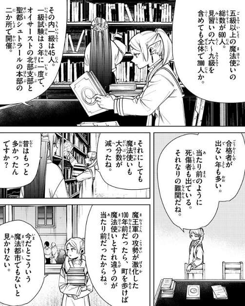 聖杖の証のおかげで無事、一級試験に参加できることになったフリーレン達は、試験の事について調べて対策を立てます。五級以上の魔法使いの総数が600人で、その内一級魔法使いは45人、一級試験は三年に一度で、オイサーストの北部支部と聖都シュトラールの本部の二か所で開催と、本には書かれています。合格者が出ない年も多く、当たり前のように死傷者も出る難関の試験のようです。フリーレンは、魔法使いの数が大分減ったと言い、魔王軍の攻勢が激化した100年前だったら、町を歩けば魔法使いとすれ違うのが当たり前だったと、昔を語ります。一級試験は二か月後なので、フリーレンとフェルンは試験に備えてみっちり修行を行うことにします。