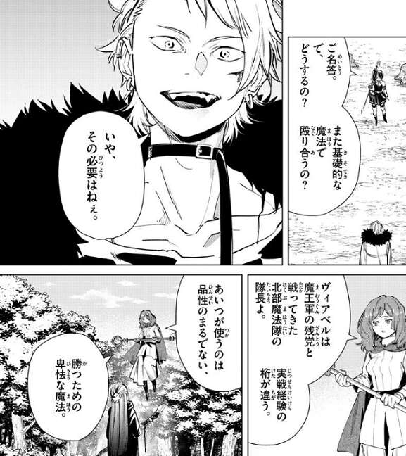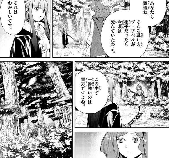 切り裂く魔法が届かないと分かりユーベルは、また基礎的な魔法で殴り合うの?と、ヴィアベルに聞きますが、その必要はねぇ、とヴィアベルは言います。場面変わってエーレはフェルンに、ヴィアベルが使う魔法には品性がまるでなく、勝つための卑怯な魔法、と言い、今、ヴィアベルと戦っている子、たぶん殺されちゃうわよ、とエーレはフェルンに忠告します。