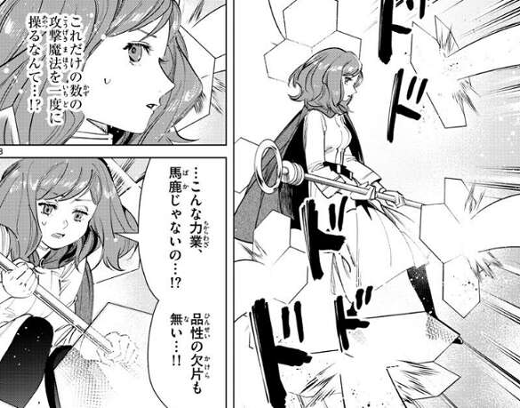 それを聞いたフェルンはエーレに飽和攻撃を仕掛けます。エーレは、これだけの数の攻撃魔法を一度に操るなんて…!?と、フェルンの攻撃に驚き、…こんな力業、馬鹿じゃないの…!?品性の欠片も無い…!!と、エーレは負け惜しみを言います。しかし、フェルンの攻撃魔法を捌ききれなくなり、エーレはフェルンに敗北します。