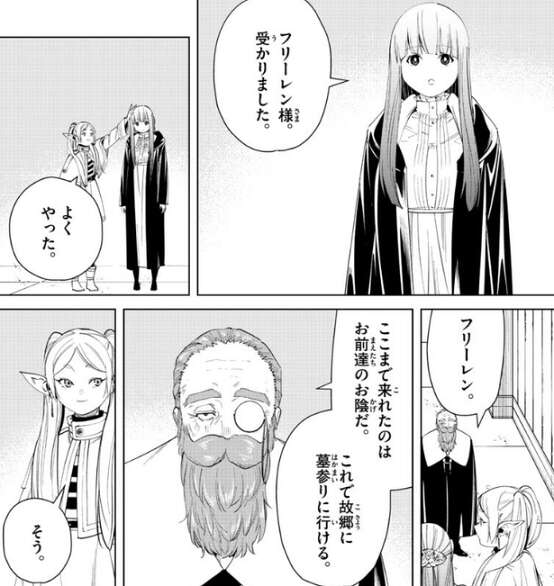 第三次試験も終わり、フリーレンは一級魔法使い試験に落ちましたが、受かったフェルンの頭を撫でて、よくやったと褒めます。デンケンは、ここまで来れたのはお前たちのお陰だ、これで故郷に墓参りに行ける、とフリーレンにお礼を言います。