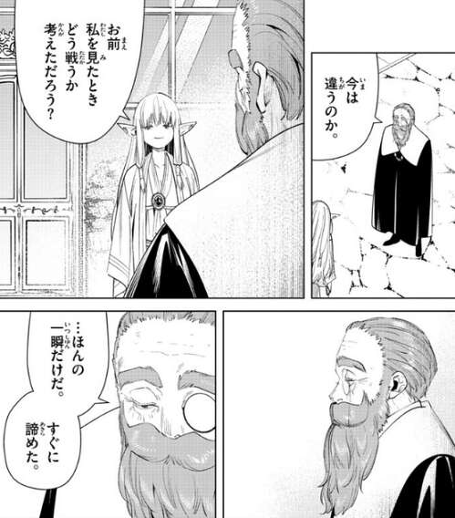 フェルンは面接前にフリーレンに、ゼーリエが色々言ってくると思うけれども、要求を呑む必要はないよ、と言われたことを思い出し、ゼーリエにフリーレンの弟子だと断言します。フリーレンは、フェルンは何を言っても合格になる、だってゼーリエの直感はいつも正しいから、と断言していました。