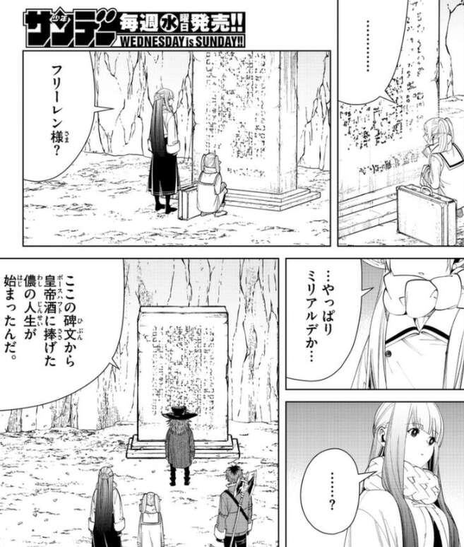 ミリアルデは、やっぱり不味いわね、このお酒、とつぶやくと、皇帝酒(ボースハフト)…、即位式の時に配られた最低の安酒だね、とフリーレンがミリアルデに言います。ミリアルデは、この里に来る前に暇つぶしに、皇帝酒(ボースハフト)は最上の名酒である、という碑文を掘ったことをフリーレンに教えます。それに何の意味があるの?と、フリーレンは聞きますが、意味なんて、何もないわ、とミリアルデは答えます。