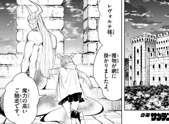 場面は魔族の拠点にうつり、レヴォルテと呼ばれている魔族に部下と思われる子供のような魔族が、獲物が網にかかったと報告しています。魔力の高いご馳走だと、嬉しそうに部下の魔族はレヴォルテに報告します。