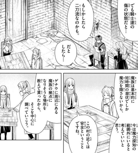 ゲナウは教会にいるようで、メトーデがゲナウの分のパンを持っていこうとしますが、フリーレンはメトーデに先に敵の分析結果を教えて欲しいと言います。そこでシュタルクがゲナウの分のパンを持って、ゲナウの所にまで行きます。一方、魔族は分析の結果、四刀流であることが判明します。