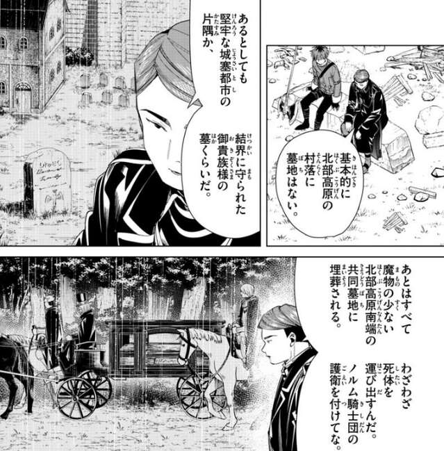 シュタルクがゲナウの所にパンを持っていくと、ゲナウは教会の決壊を張り替えていました。教会の中には村人の死体もあるので、より強力なものに張り替えていました。シュタルクが、なんで死体をそのままにしているんだ?埋葬するなら手伝うぜ、とゲナウに言いますが、北部高原では基本的に村落に墓地はないことを、ゲナウはシュタルクに教えます。結界に守られた貴族の墓以外は、魔物の少ない北部高原南端の共同墓地に埋葬されるようです。北部高原では下手に墓を作ると、腐臭に釣られて魔物が集まってくるようで、地獄のような光景になるので墓は作りません。ノルム商会は随分前から死体を燃やして火葬にするように主張しているようですが、聖職者に反対されているようです。