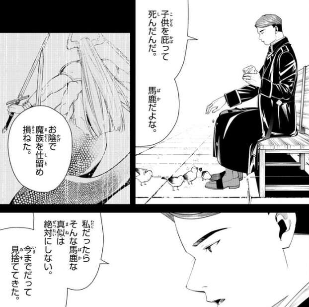 ゲナウはメトーデに前の相棒の話をし始めます。ゲナウの前の相棒は、ゲナウとは正反対のいい奴だったようですが、子供を庇って死んでしまったようです。ゲナウはそんな前の相棒の事を馬鹿だと言い、私だったらそんな馬鹿な真似は絶対にしない、今までだって見捨ててきた、とメトーデに言います。