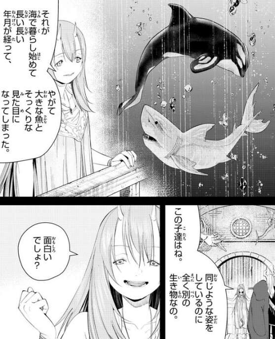 ソリテールは収斂進化という言葉を知っている?とマハトに聞いた後、魚類と哺乳類の骨格は全然違うとマハトに教えます。そして、哺乳類の方の祖先は元々陸の生き物だったが、海で暮らし始めて長い長い年月が経って、やがて大きな魚とそっくりな見た目になってしまった、とソリテールはマハトに話します。同じような姿でも、全く別の生き物だと言い、ソリテールは笑いながらマハトに面白いでしょ?と、話しかけます。