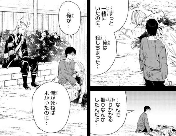 少年が魔族には理解できない感情を抱いているとマハトは知ると、それが“悪意”なのか、それとも“罪悪感”なのかを少年に尋ねます。少年は無言でマハトを睨むと、…そうか、罪悪感か、とマハトは嬉しそうに言います。少年がナイフをマハトに向けて殺そうとしますが、マハトはあっさりと少年を武器で殺してしまいます。そして、名前も知らない少年にありがとう、と礼を言うと、何も知らない奴が何百人死のうが何も感じないのは当然だ、と歩きながらつぶやきます。