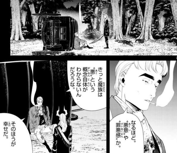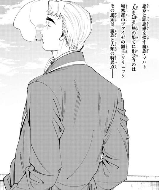 そんな事をつぶやくグリュックにマハトは一つ質問がある、と言うと、グリュックは煙草を吸い終わるまでならな、と答えます。マハトはグリュックに、“悪意”や“罪悪感”に関して質問します。グリュックは魔族には“悪”という概念自体がわからないんだろう、と推測し、その方が幸せと言います。そして魔族には“正義感”もないとグリュックは知ると、自分が城塞都市ヴァイゼの領主で実験などあってないような、お飾りの領主であることをマハトに話します。