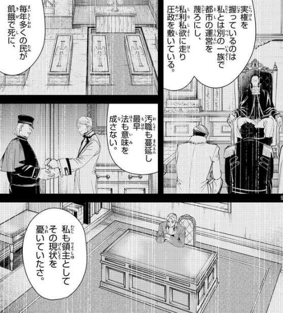 城塞都市ヴァイゼは、帝都での政争に敗れた貴族が最後に行きつく場所で、さらにここでも懲りずに多くの貴族が権力闘争を続けている、とグリュックは話します。この城塞都市ヴァイゼで実験を握っているのは、グリュックとは別の一族で私利私欲に走り圧政を敷いて、毎年多くの民が飢餓で死に、汚職が蔓延していて、グリュックは領主としてその現状を憂いていました。