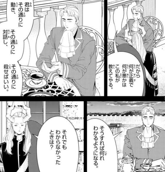 マハトが未だに“悪”の概念が分からないと言うと、グリュックは、何が正義で何が悪かはこの私が教えてやる、その通りに動き、その通りに対話し、その通りに殺せばいい、とマハトに言います。そうすれば何れわかるようになると、とグリュックは言いますが、それでもわからなかったときは?と、マハトは尋ねます。