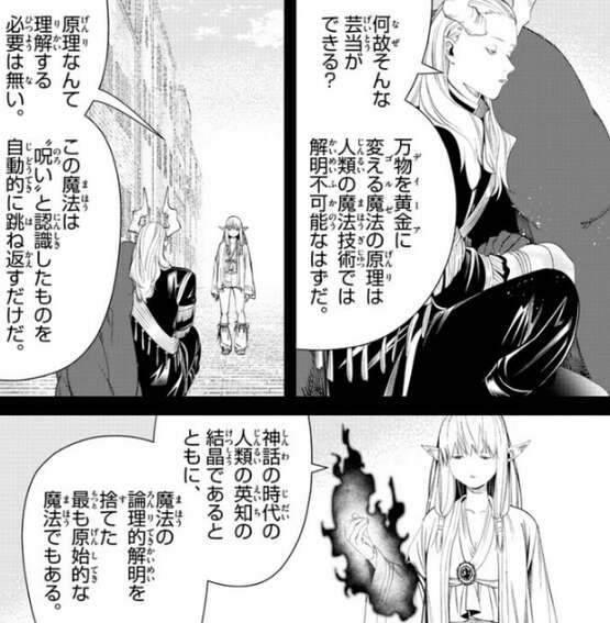 しかし、すぐにマハトはゼーリエから距離をとります。ゼーリエはマハトの魔法を跳ね返そうとしたようで、もう少し本気を出してくれていれば、お前の全身を黄金に変えることもできたのだがな、とゼーリエはマハトに言います。