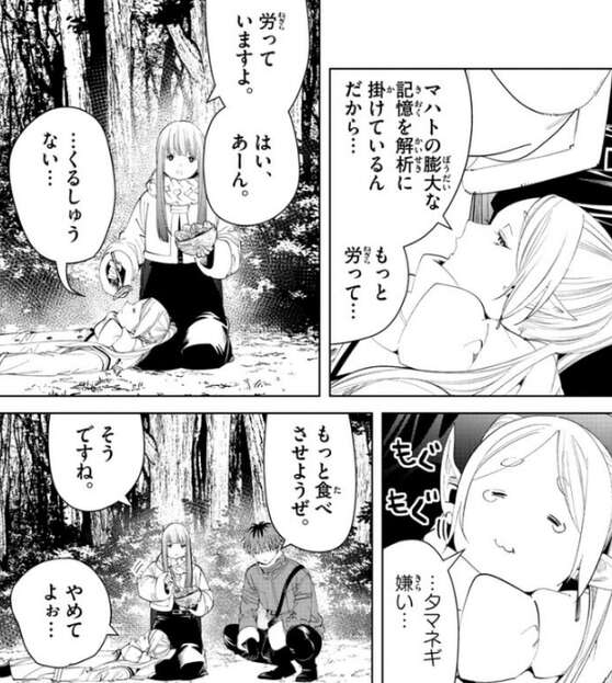 フリーレンは、マハトの膨大な記憶を解析に掛けているんだから、もっと労って…、とシュタルクに言いますが、フェルンにタマネギを食べさせられて、…タマネギ嫌い…、とフェルンはつぶやきつつ、涙目になります。