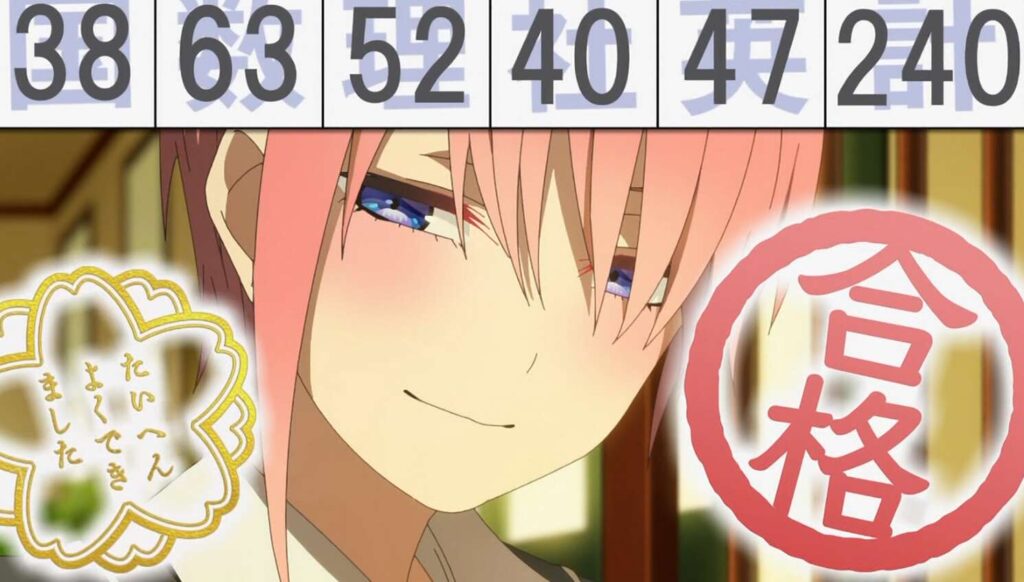 そして期末試験も終わり、五人全員が赤点を回避します。四葉は合計184点、五月は合計224点、三玖は合計238点、そして一花は合計240点と、一花が一番高い合計点を取り、一花は三玖に意地を見せます。
