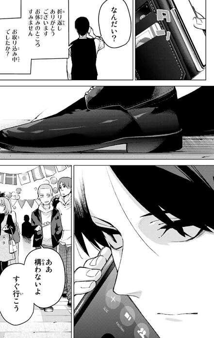 そこに父親の勇也と妹のらいはが合流し、勇也は二乃に五つ子たちの父親=マルオを見ていないか、聞いてきます。