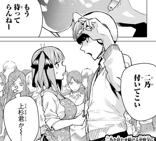 場面変わって、二乃が友達と脱出ゲームを楽しんでいます。何故か広場に二乃がいると噂が立ってしまい、男子生徒が広場に行こうと話をしています。恐らく、広場では二乃に変装した一花がいるのでしょう。