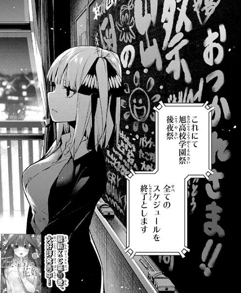今回 学園祭 後夜祭が終わった二乃は、全てのスケジュールが終了したアナウンスを、教室の黒板を背に聞いています。これは101話の一花の時も考慮すると、五つ子たちが全員学校のどこかで風太郎を待っている状況なのかも?